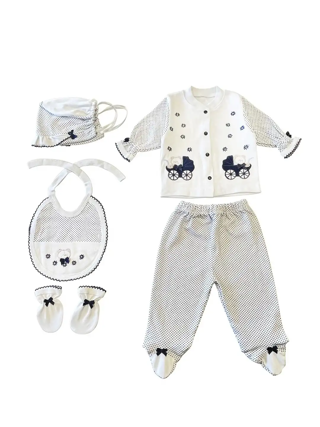 Paket İçeriği: 1 Adet Çıtçıtlı bebek Ceketi, 1 adet Patikli Pantolon, 1 adet Şapka, 1 adet lastikli Önlük, 1 çift Eldiven